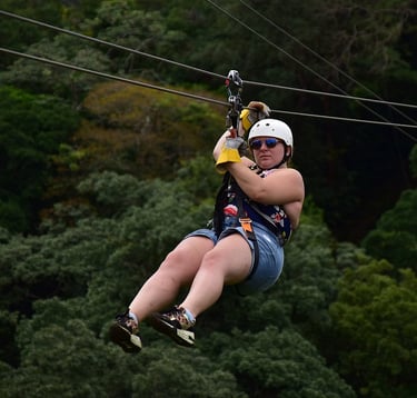 Once activated, let's continue with an unforgettable zip line adventure, 7 lines ... flying over rivers and canyons, surrounded by the forest we can see the top of the volcano in the far.